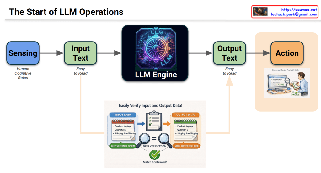The diagram suggests that successful LLM operations are not just about the model’s intelligence, but about transparency and verification. By keeping data “Easy to Read” and involving “Human Verification,” the system ensures that AI-driven actions are reliable and grounded in human-defined rules.