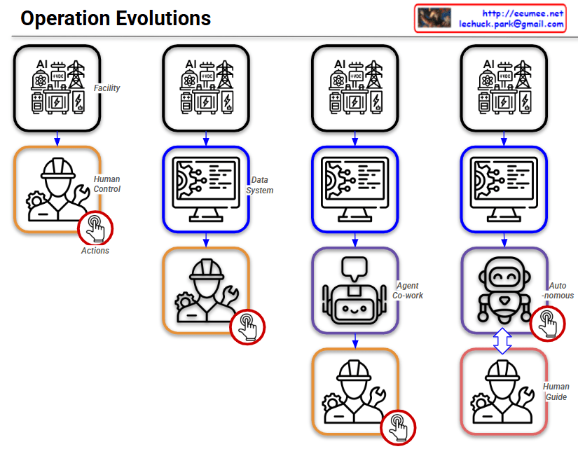 - Description: This is the ultimate stage of operational evolution. The authority to execute Actions has shifted from the human to the AI. The AI analyzes data, makes independent decisions, and autonomously controls the facility. The human’s role transitions from a direct controller to a ‘Human Guide’, supervising the AI and providing high-level directives. The two-way arrow indicates a continuous, interactive feedback loop where the human and AI collaborate to refine and optimize the system.