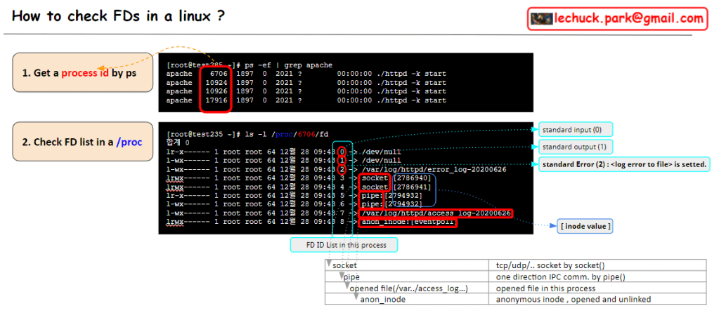 and more you can get more information with cat /proc/[pid]/fd/[fd id :0~]. try it 🙂