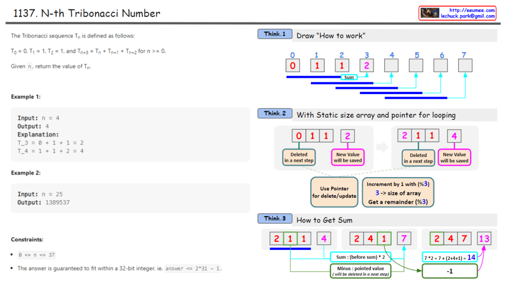 Leetcode 1137. N-th Tribonacci Number Posted on 2023-02-052023-02-05 by lechuck park Share this: Click to share on X (Opens in new window) X Click to share on Facebook (Opens in new window) Facebook Like Loading... Published by lechuck park I love to learn computer tech and help people by the digital. View all posts by lechuck park