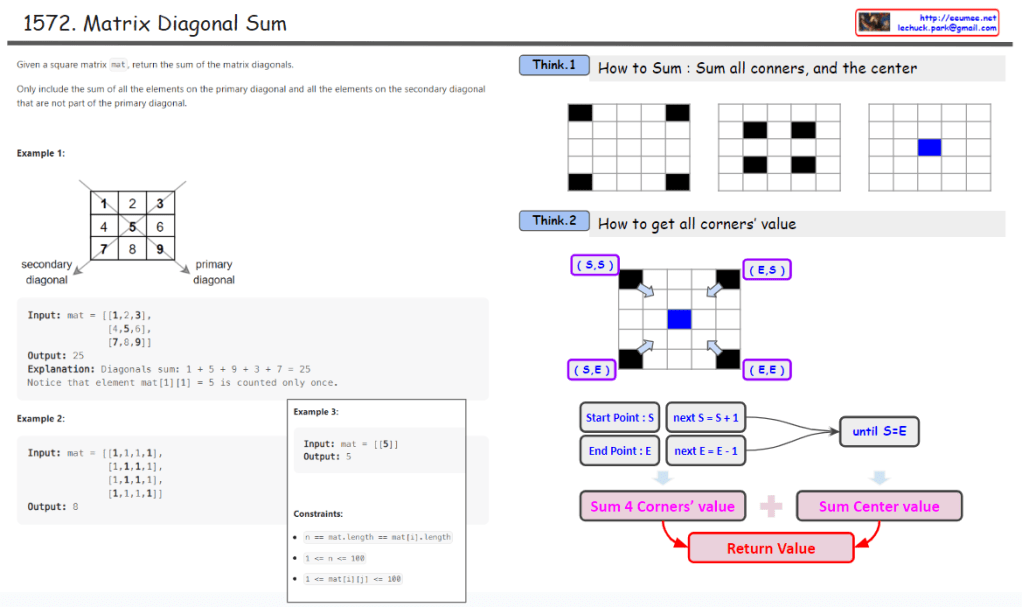 Leetcode 1572. Matrix Diagonal Sum Posted on 2023-05-15 by lechuck park Share this: Click to share on X (Opens in new window) X Click to share on Facebook (Opens in new window) Facebook Like Loading... Published by lechuck park I love to learn computer tech and help people by the digital. View all posts by lechuck park