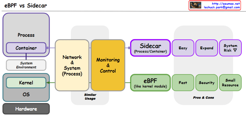 The diagram shows that eBPF and Sidecar are utilized for network and system monitoring and control, with eBPF providing the advantages of fast performance, security, and low resource consumption, while Sidecar offers ease of use, scalability, and reduced system risk.