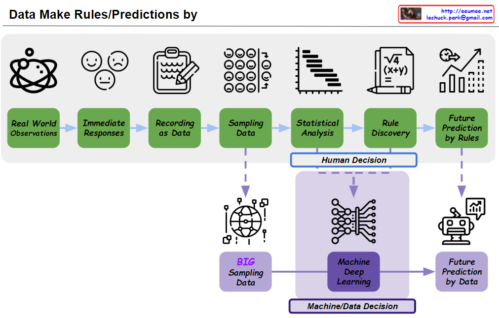 The image depicts the evolution of the decision-making process from data collection to conclusion. Where decisions were once made entirely by humans before the advent of AI/ML, the progress in big data processing and machine learning/deep learning now allows machines or the data itself to make decisions. Initially, the process was human-centric, starting from real-world observations to data recording, followed by statistical analysis and rule discovery to predict the future. With advancements, we now extract large samples from large datasets and utilize deep learning to recognize complex patterns, leading to a machine-centric process that predicts the future based on data. This shift emphasizes the power of data and the significance of machine learning.