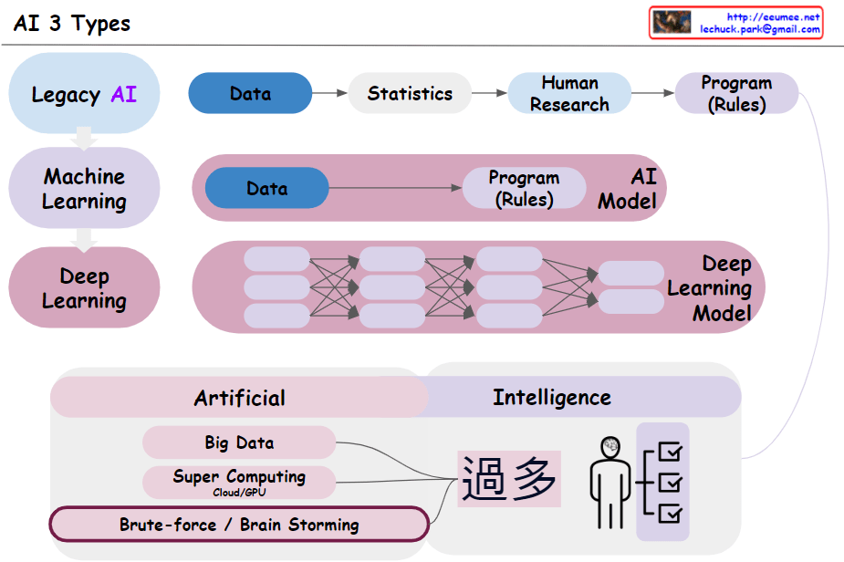 1. Legacy AI derives statistics from data and transforms them into rule-based programs through human research.