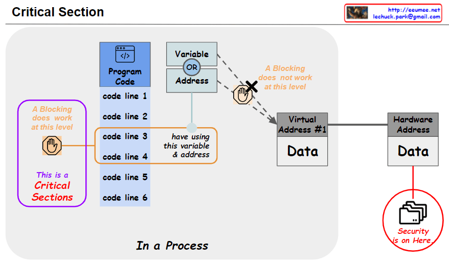 In the diagram, the “Critical Sections” are highlighted to signify that these blocks of code are where ‘blocking’ occurs, allowing only one thread or process to operate on the shared resources at a time, thus ensuring data integrity and preventing race conditions. The transition from code lines to data, through variable addresses and virtual address mapping to the actual data in hardware, suggests a layered approach to security and access control.