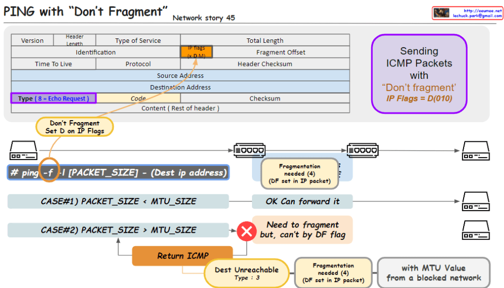 The image outlines a networking concept involving the transmission of ICMP (Internet Control Message Protocol) packets with the “Don’t Fragment” flag set, which is part of the IP (Internet Protocol) flags. Here’s a breakdown of the key elements in the image: