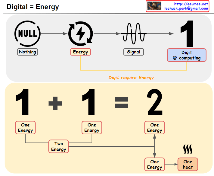 this image illustrates the concept that “Digital equals Energy.” The first row shows the transformation from ‘NULL’, which represents nothingness, into a signal through energy, and then into a digital ‘1’ for computing. The second row demonstrates that digital operations require energy by showing that adding ‘1’ and ‘1’ results in ‘2’, with each ‘1’ requiring a unit of energy and the process generating heat, indicating energy loss.
