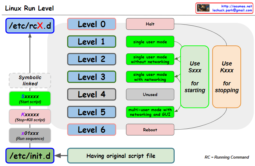 The image describes the Linux Run Levels, which are modes of operation in Unix-like operating systems. It explains the directories /etc/rcX.d where X is the run level number, and /etc/init.d which contains the original script files. The various levels are highlighted: