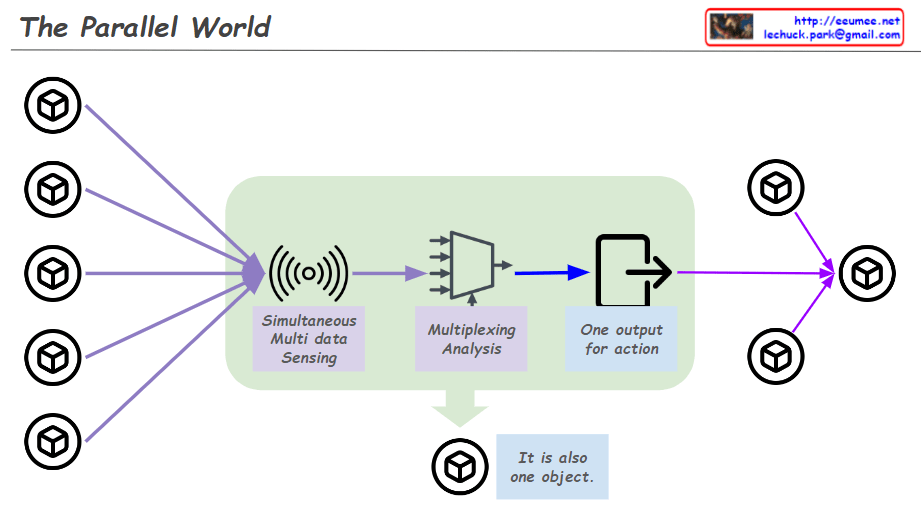 The Parallel World diagram showcases a robust system architecture where multiple hexagon-shaped data sources represent a concurrent data collection network. Each source simultaneously sends information to a central processing unit, highlighted by a symbol of radio waves, indicating simultaneous multi-data sensing. This information undergoes parallel processing within the green-shaded area, where a ‘Multiplexing Analysis’ mechanism filters and combines the various data streams. Although the visible outcome is a single decisive output for action, this representation underscores the substantial parallel processing that occurs behind the scenes. This parallelism ensures that the system maximizes efficiency and response times, embodying the concept that, in the grand scheme, the majority of operations are processed in parallel, even if they converge into a singular action.