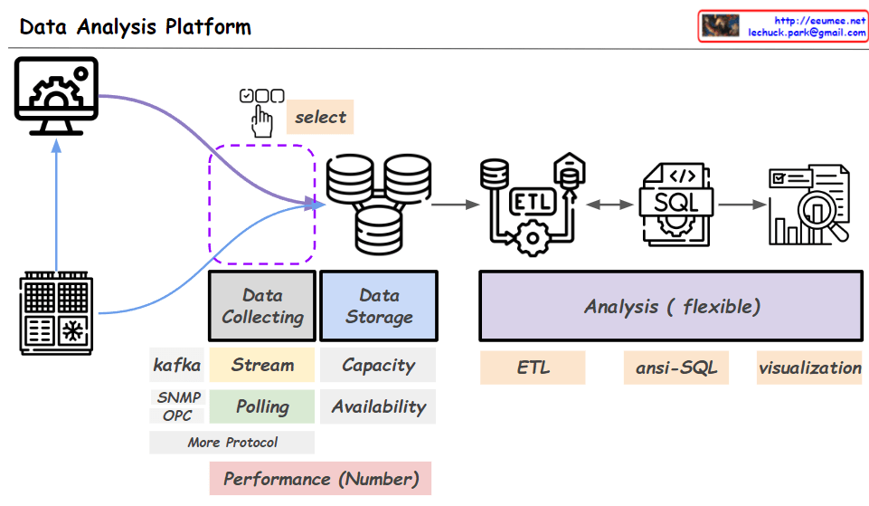 The key aspects highlighted are the collection of data from actual equipment/systems, selective data collection based on equipment configuration, data storage, ETL process, SQL database, analysis tools (ETL, SQL, visualization), performance metrics, and the analysis platform user interface.