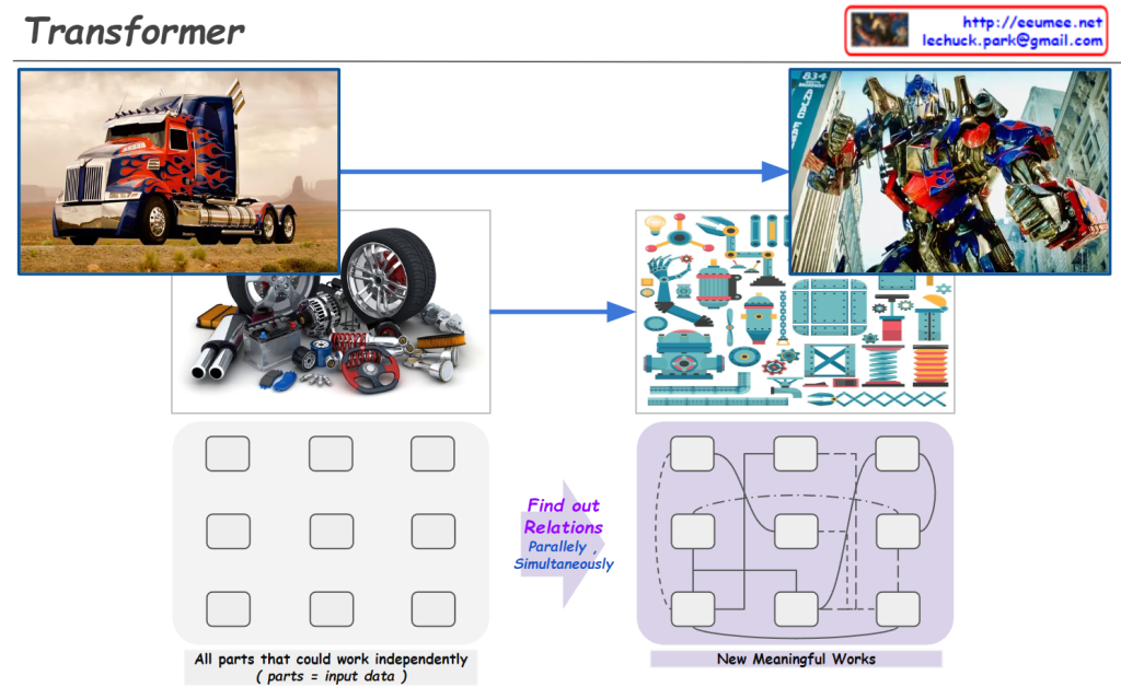 So in essence, the image draws a clever analogy between transforming vehicles and how Transformer models process and “transform” input data into contextualized representations through its parallelized and self-attentive computations.