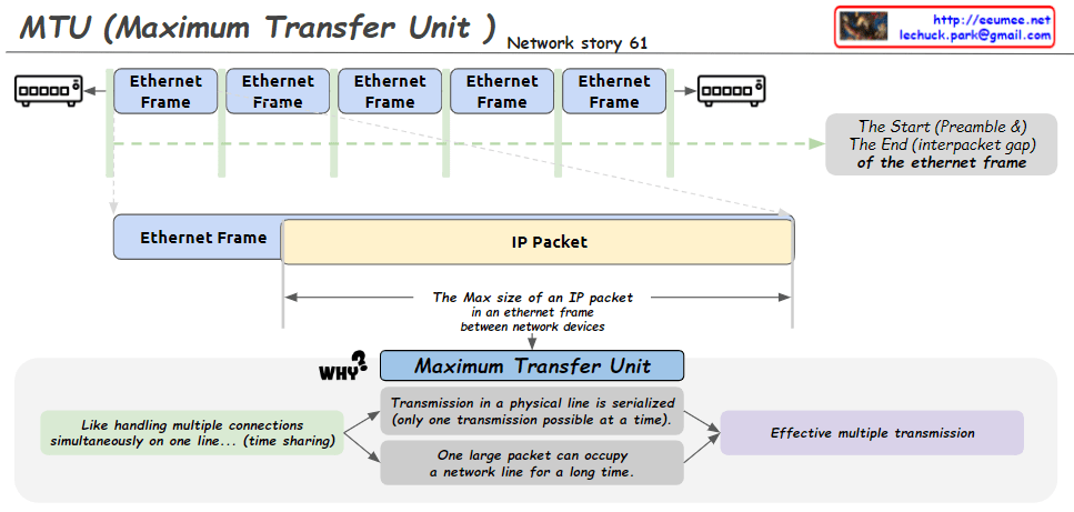 The image shows multiple Ethernet frames containing an IP packet inside. The MTU determines the maximum size of this IP packet that can fit within an Ethernet frame. Having a proper MTU size is important for efficient data transmission and avoiding fragmentation.