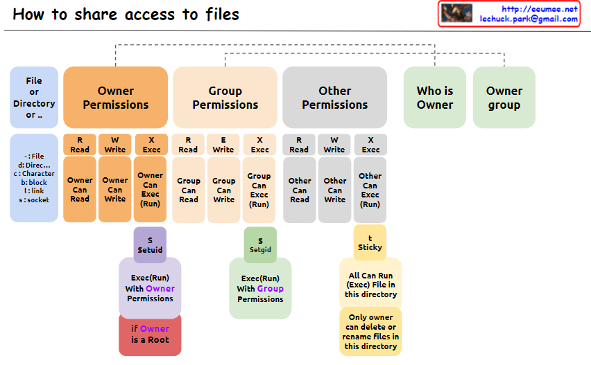 - File Permissions Structure: The image depicts how access rights to files or directories are shared in Unix/Linux systems. Permissions are divided into owner, group, and other users.