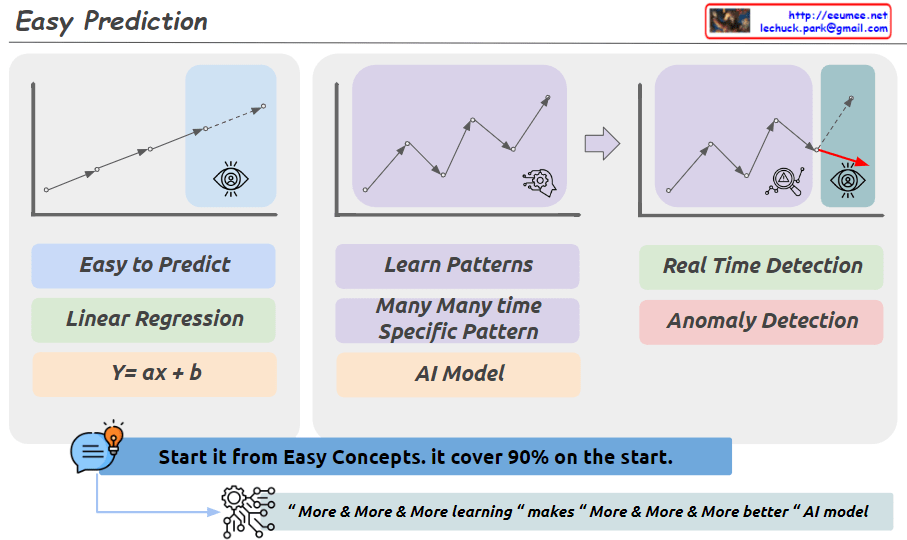 In summary, the image highlights a step-by-step approach: starting with simple concepts to build a foundation, then utilizing AI models to learn complex patterns, and continuously improving the models through ongoing data learning and training. The key emphasis is on starting with the basics, while recognizing the potential of advanced AI techniques when combined with extensive learning from data.