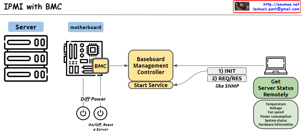 - Communication process: The interaction between the remote computer and BMC is shown to involve 1) INIT (initialization) and 2) REQ/RES (request/response) stages, described as functioning similar to SNMP.