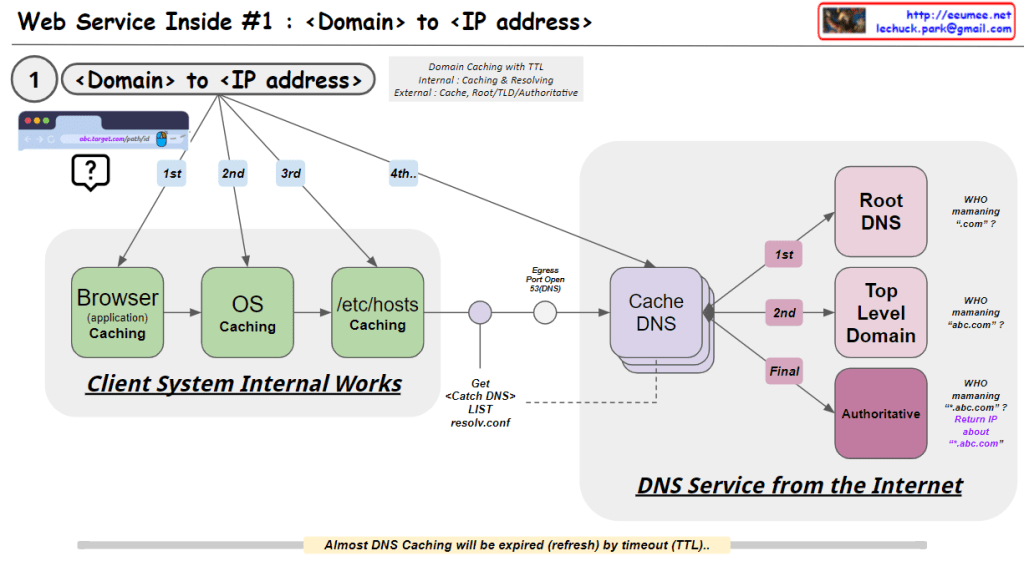 This image illustrates the process of converting a domain name to an IP address, which is the first step in web service operations. Here’s a breakdown of the image: