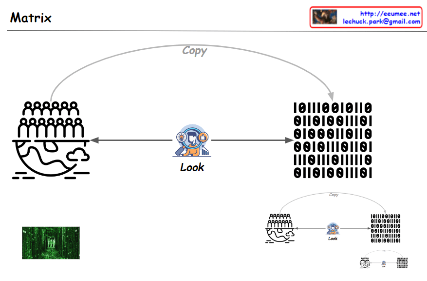 This image demonstrates human attempts to observe and understand the real world, then transfer it into a digital realm. It connects to the concept of digital twins – digital replications of real-world entities. The image also suggests that this process can repeat and intensify indefinitely, presenting both the possibilities and challenges of technological advancement. Ultimately, it succinctly illustrates the increasing digitization of our society and the philosophical questions this trend raises.