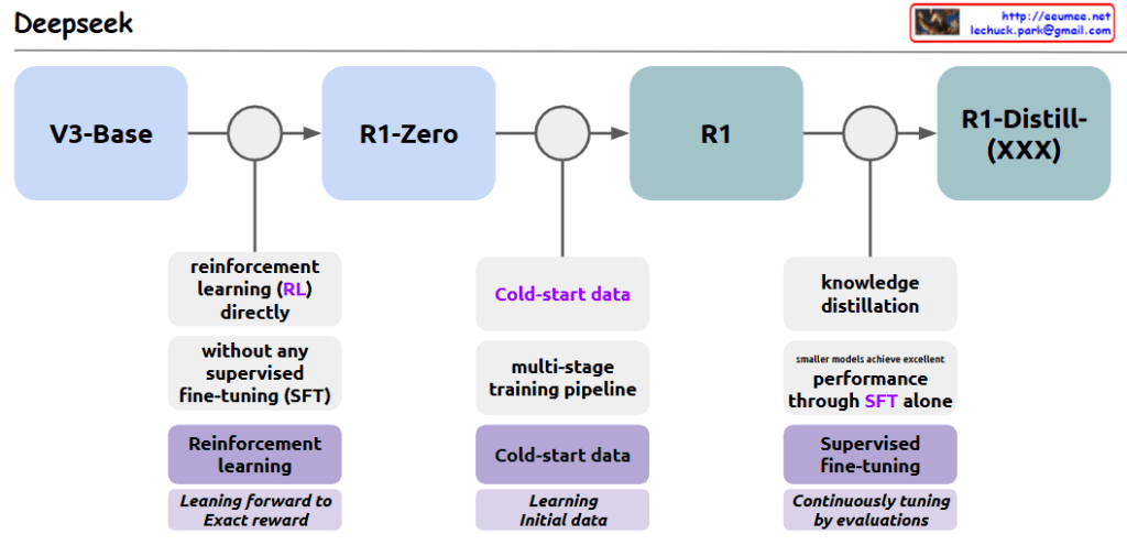The evolution pipeline of the Deepseek model consists of three major stages: