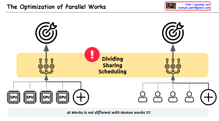The exclamation mark in the center draws attention to these challenges, while the message at the bottom states: “AI Works is not different with Human works!!!!” – emphasizing that the difficulties in coordinating independent processors toward a unified goal are similar whether we’re talking about computer processors or human teams.