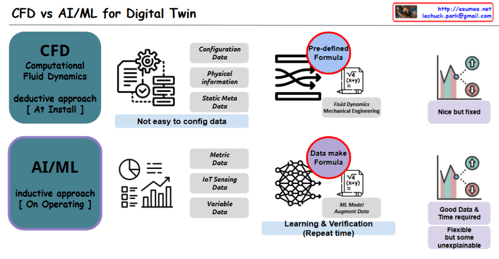 The key insight here is that both CFD and AI/ML approaches have unique strengths. CFD provides a rigorous, physics-based model with predefined formulas, while AI/ML offers dynamic, adaptive learning capabilities. The future of digital twin technology likely lies in finding an optimal balance between these two methodologies, leveraging the precision of CFD with the flexibility of machine learning.