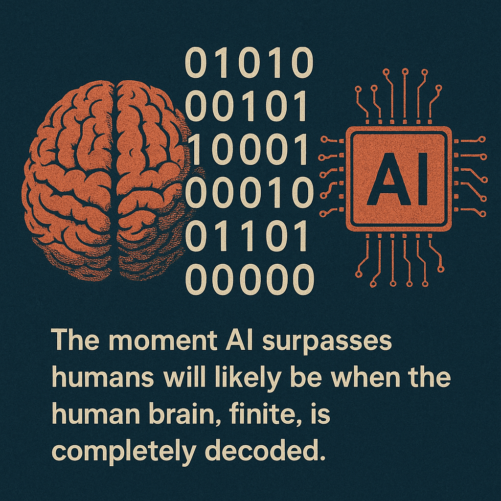 The moment AI surpasses humans will come only if the human brain is proven to be finite.