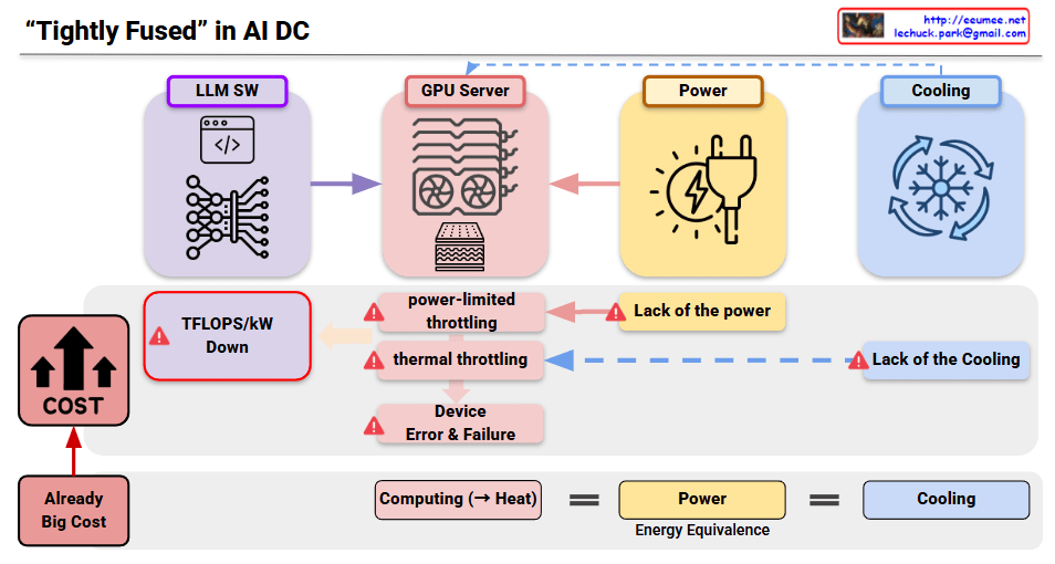This diagram highlights how AI datacenters require perfect balance between computing, power, and cooling systems – any bottleneck in one area cascades into performance degradation and cost increases across the entire infrastructure.