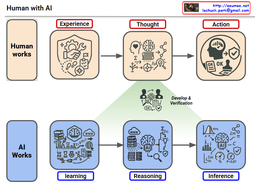 The green arrow in the center with “Develop & Verification” represents the process where humans verify AI’s reasoning results and make final judgments (Thought) to connect them to actual actions (Action).