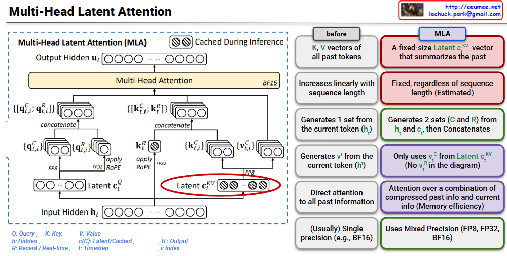 - Summarizes past information with a fixed-size Latent vector (c^KV)