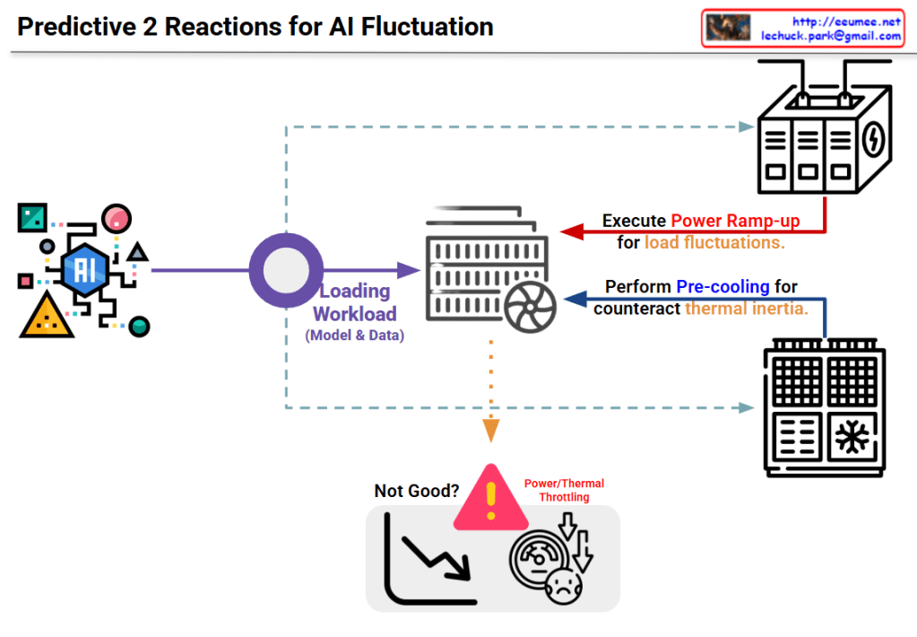 This diagram presents a predictive two-stage reaction system for AI workload management that combines proactive power ramp-up and pre-cooling to prevent thermal throttling. By anticipating load fluctuations before they occur, the system maintains optimal performance without degradation. The approach represents a shift from reactive to predictive infrastructure management in AI computing environments.