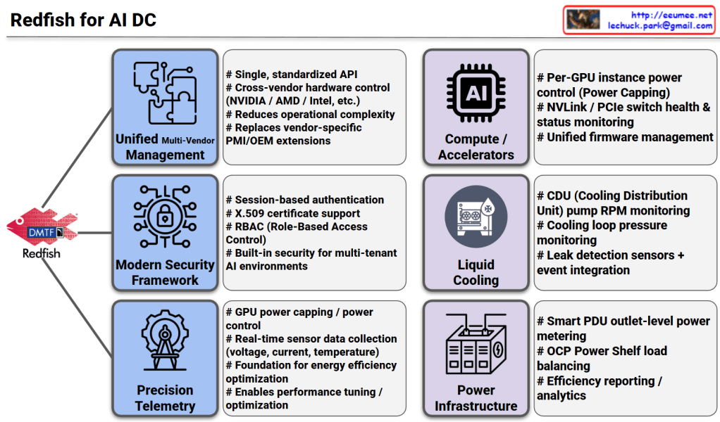 This image illustrates the pivotal role of the Redfish API (developed by DMTF) as the standardized management backbone for modern AI Data Centers (AI DC). As AI workloads demand unprecedented levels of power and cooling, Redfish moves beyond traditional server management to provide a unified framework for the entire infrastructure stack.