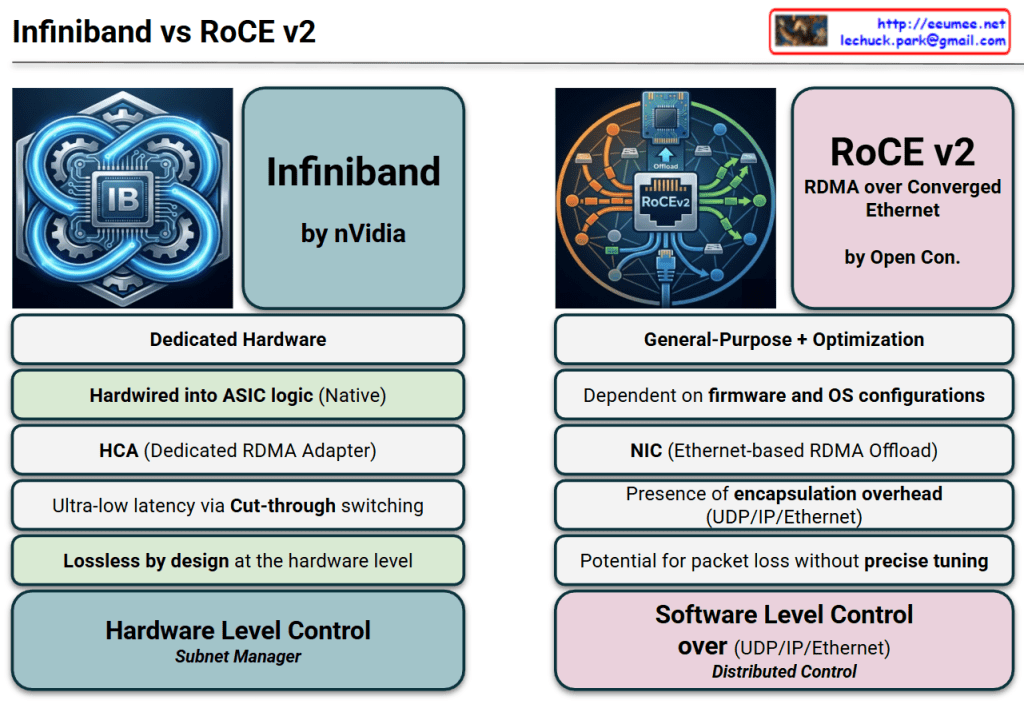 Efficiency & Reliability: InfiniBand is “lossless by design” with minimal overhead via cut-through switching, while RoCE v2 incurs encapsulation overhead and requires precise network tuning to prevent packet loss.