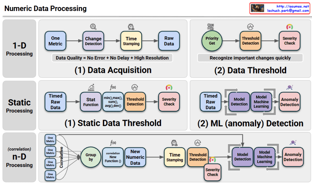 - 1-D Processing (Real-time Detection): This layer focuses on individual metrics. It emphasizes high-resolution data acquisition with precise time-stamping to ensure data quality. It uses immediate threshold detection to recognize critical changes as they happen.