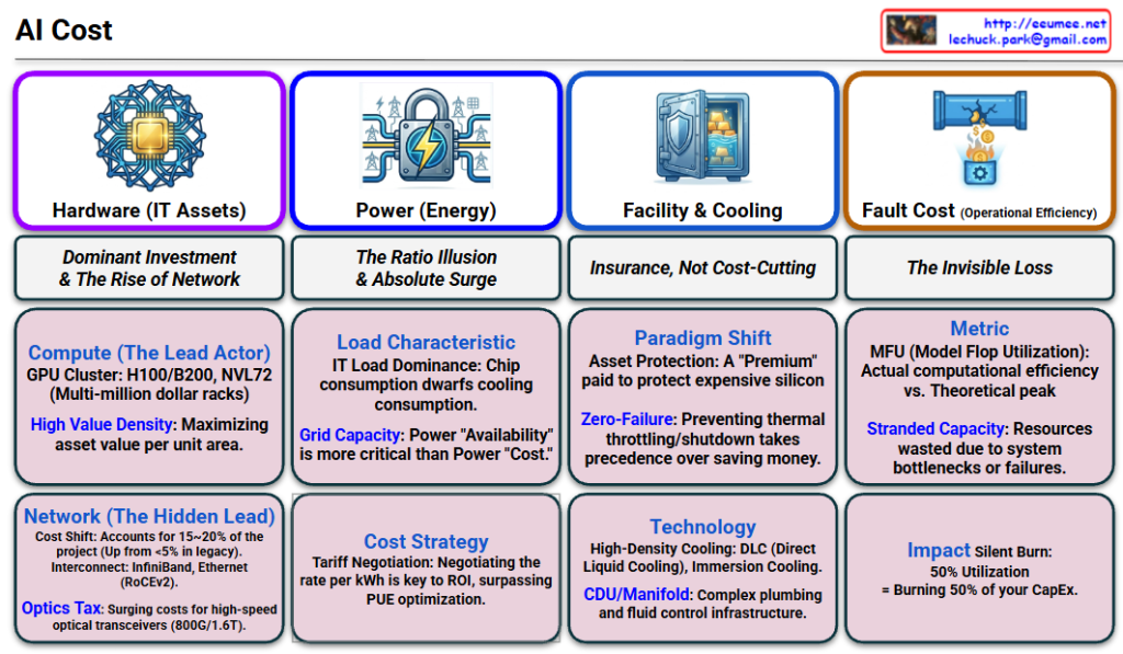 The AI Data Center is a “High-Value Density Asset” where Hardware dominates CapEx (~70%), Power dominates OpEx dynamics, and Facility acts as Insurance. However, the Operational System (OS) is the critical differentiator that prevents Fault Cost—the silent killer of ROI—by maximizing MFU.