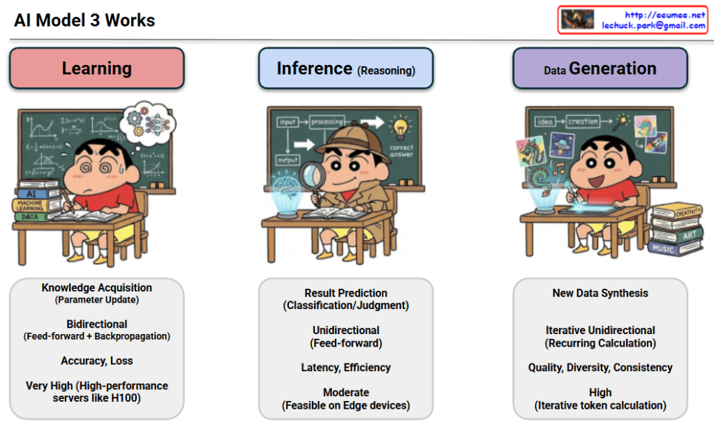 The provided image illustrates the three core stages of how AI models operate: Learning, Inference, and Data Generation.