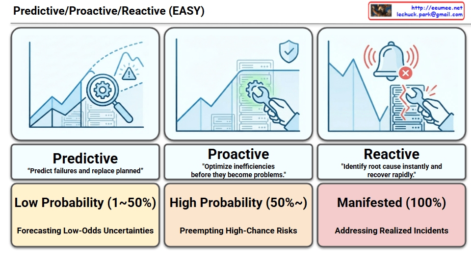 Manage risks by forecasting low-probability (~50%) uncertainties (Predictive), preempting high-probability (50%~) inefficiencies (Proactive), and rapidly recovering from 100% manifested incidents (Reactive).