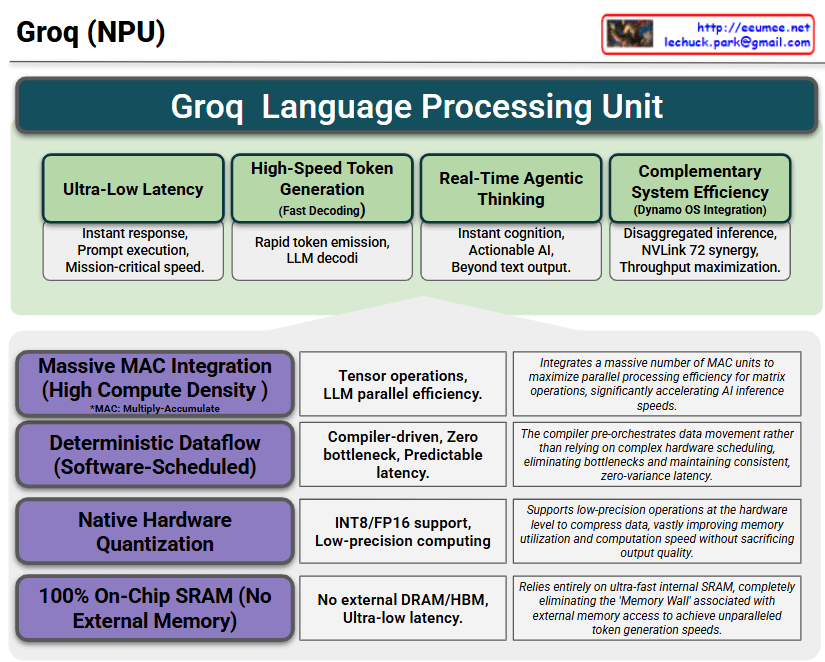 - The Speed Secret: It highlights that Groq’s unprecedented speed and predictable latency come from eliminating external memory (100% SRAM) and relying on software-scheduled dataflow.