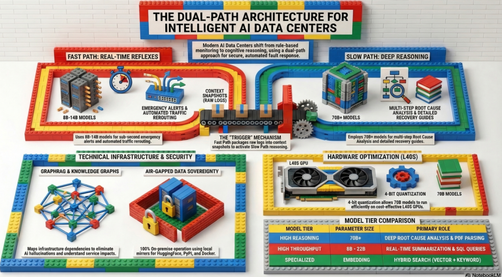 The proposed AI DC Intelligent Incident Response Platform upgrades traditional data center monitoring to an “Autonomous Operations” system within a secure, air-gapped on-premise environment. It features a Dual-Path architecture that utilizes lightweight LLMs for real-time automated alerts (Fast Path) and high-performance LLMs with GraphRAG for deep root-cause analysis (Slow Path). By structuring fragmented manuals and comprehensively mapping infrastructure dependencies, this system significantly reduces recovery time (MTTR) and provides a highly scalable, cost-effective solution for hyper-scale AI data centers