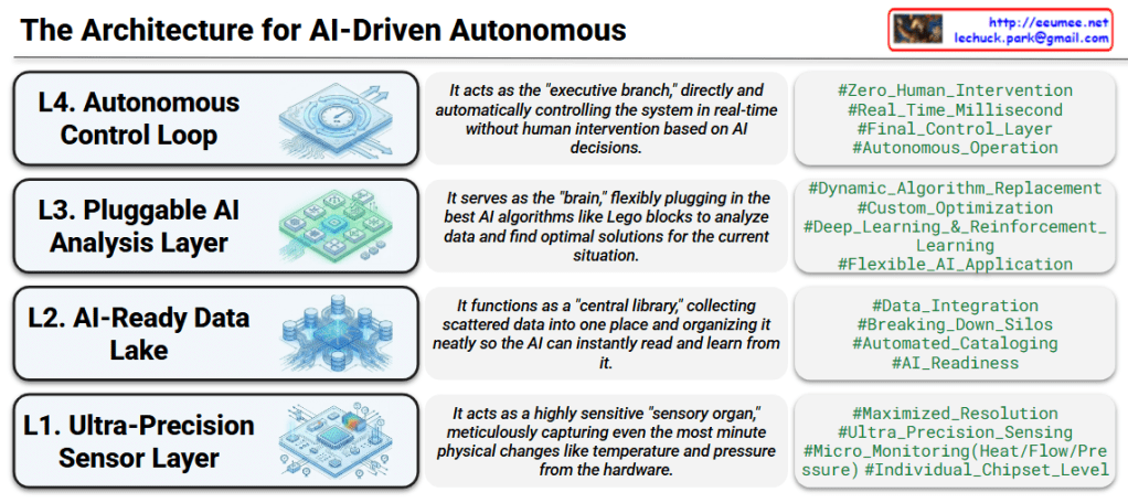 • L4. Autonomous Control Loop (The “Executive Branch”)Finally, the insights from the brain are turned into action here. This layer operates in real-time (down to the millisecond) to send control signals back to the system. It executes decisions entirely on its own, achieving true autonomous operation with zero human intervention.