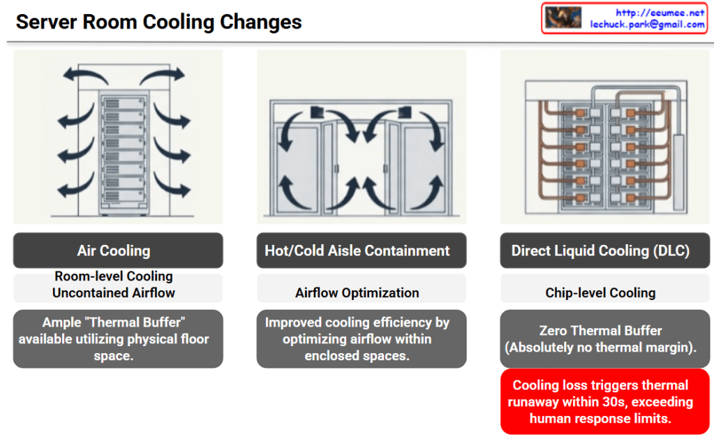 The provided image illustrates the evolution of data center cooling methods and the corresponding increase in risk—specifically, the drastic reduction of available thermal buffer space—categorized into three stages.