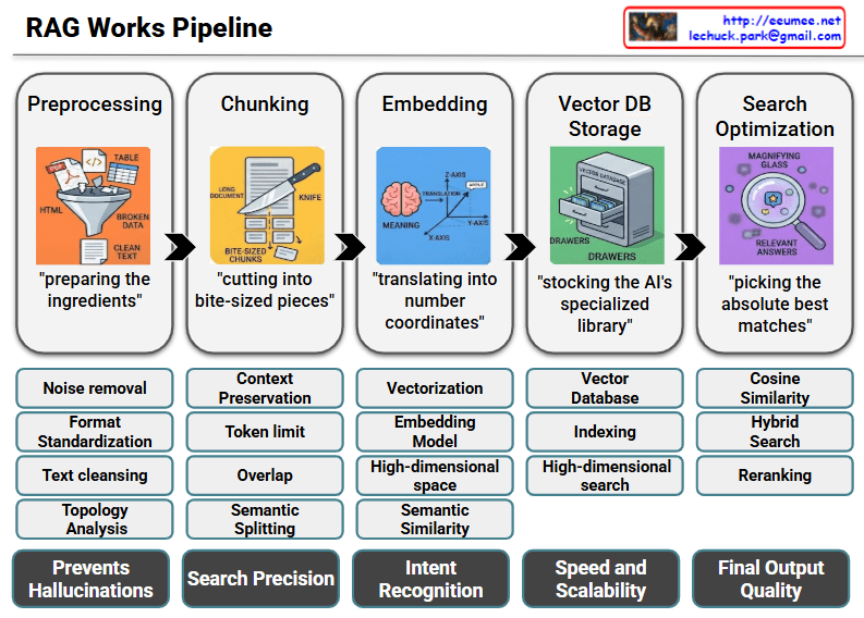 Here, the text chunks are converted into mathematical vectors mapped in a high-dimensional space (X, Y, Z axes). This vectorization captures the underlying semantic meaning and context of the text, allowing the system to go beyond simple keyword matching and achieve true intent recognition. - Step 4: Vector DB Storage (“stocking the AI’s specialized library”)