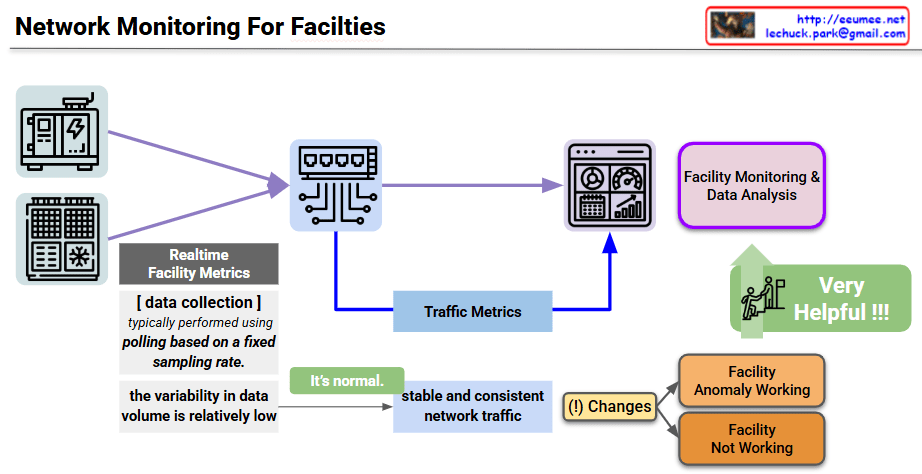 The provided image is a conceptual diagram illustrating how to monitor the status and detect anomalies in critical industrial facility infrastructure (such as power and cooling) through network traffic patterns. I also noticed the author’s information (Lechuck) in the top right corner! Let’s break down the main data flow and core ideas of your diagram step-by-step.