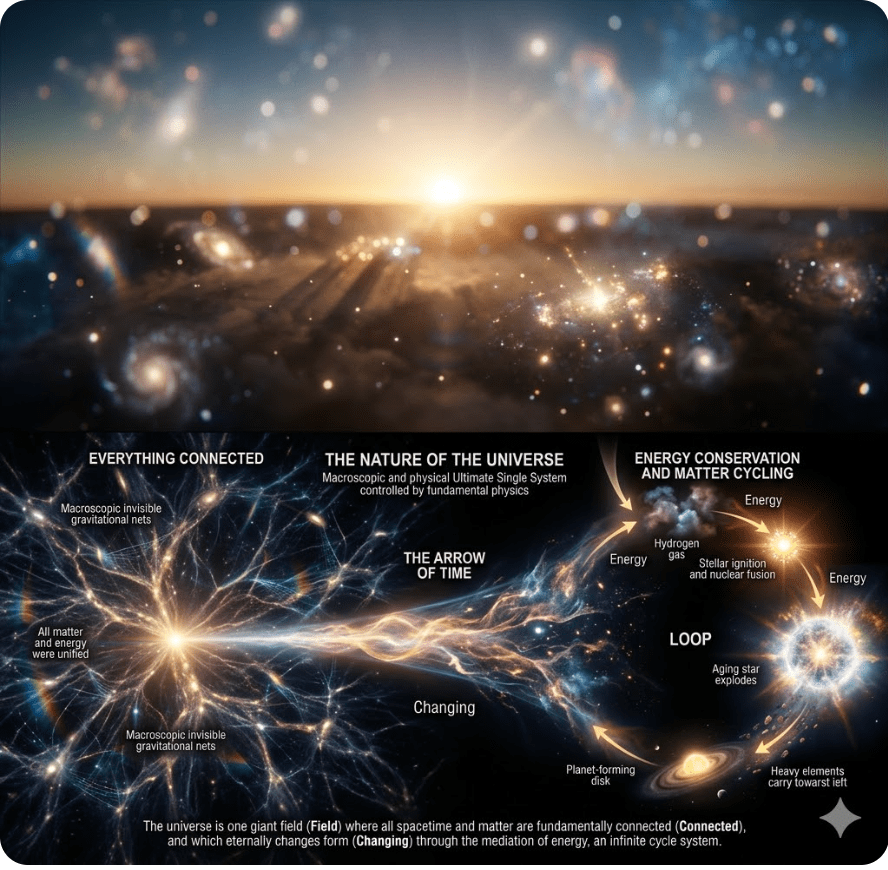 - Overall Synthesis: The summary defines the universe as a singular field, connected in all spacetime and matter, that eternally changes form through energy, functioning as an infinite cycle system.