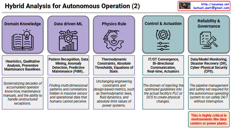 The image illustrates a “Hybrid Analysis” framework designed to achieve true Autonomous Operation. It outlines five core pillars required to build a reliable, self-driving system for high-stakes environments like AI data centers or power plants. The architecture combines three analytical foundations (purple) with two execution and safety layers (teal).