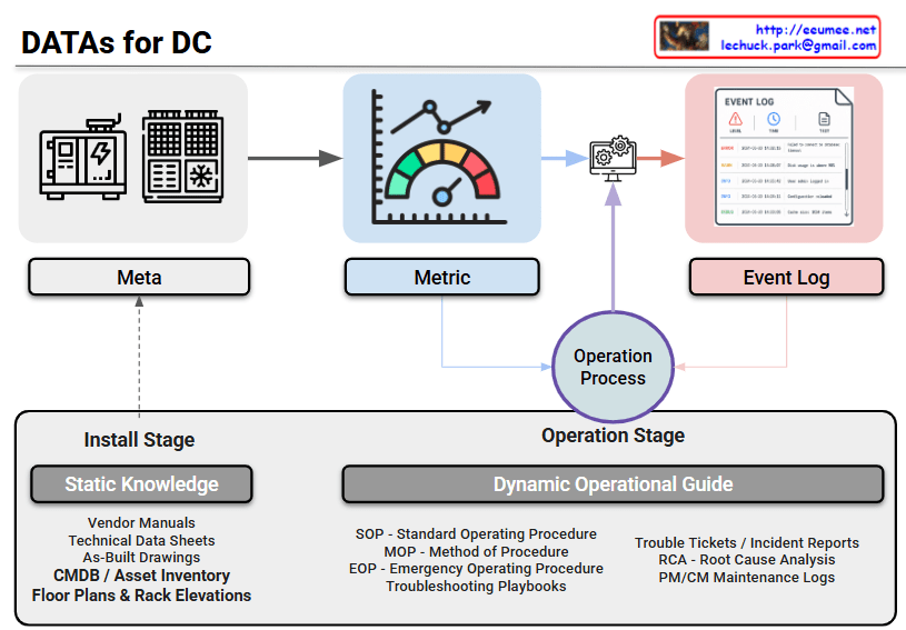 - Install Stage (Static Knowledge): This is the baseline documentation established during construction and deployment. It includes Vendor Manuals, Technical Data Sheets, As-Built Drawings, CMDB, and Rack Elevations. Notice the dotted arrow showing how this static knowledge directly informs and establishes the “Meta” data above.