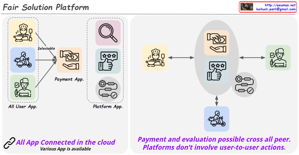 - All users (chefs, delivery personnel, customers, etc.) can directly choose which service apps to use for actual interactions (ordering, payment, delivery, evaluation, etc.).