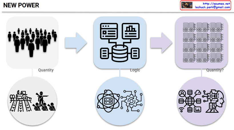 This diagram illustrates a fascinating return in power structures. While efficiency, innovation, and network effects – these ‘logical’ elements – were important during the digital transition period, the ‘quantitative competition’ has returned as the core with the full advent of the AI era.