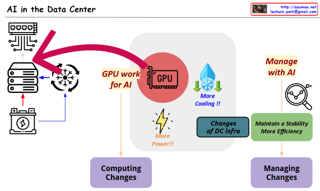 This diagram highlights the importance of diversifying reliable power sources, efficient power control, and optimized power management according to GPU workload in AI data centers.