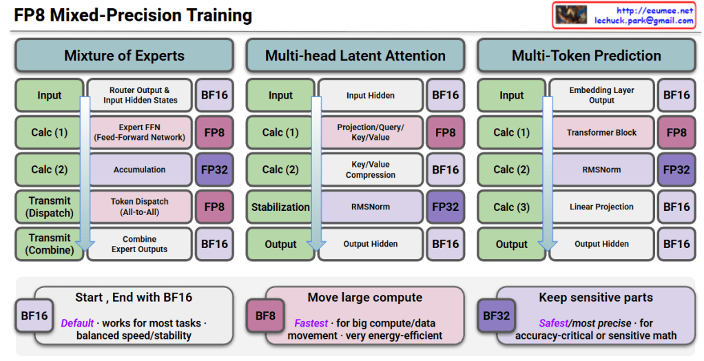 - FP32: Applied to critical operations like RoPE (maintains numerical stability)