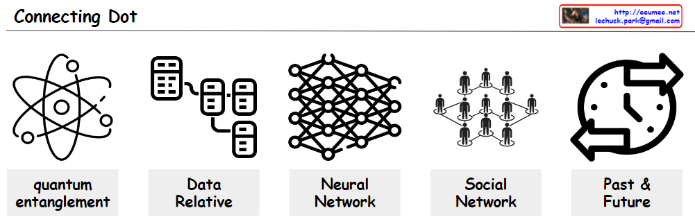 The image demonstrates how various distinct concepts are interconnected, emphasizing that all items are linked. ‘Quantum entanglement’ depicts particles whose states are interconnected regardless of physical distance, while ‘Data Relative’ represents the interactions between data. ‘Neural Network’ illustrates an AI model that learns complex data patterns, and ‘Social Network’ symbolizes the web of human relationships. Lastly, ‘Past & Future’ symbolizes the continuous changes occurring over time. All these concepts are interlinked, suggesting that new insights and innovations can arise from understanding these connections.