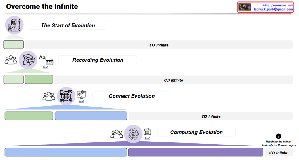 This image presents a philosophical game interface titled “Overcome the Infinite” that chronicles the evolutionary journey of human civilization through four revolutionary stages of innovation.